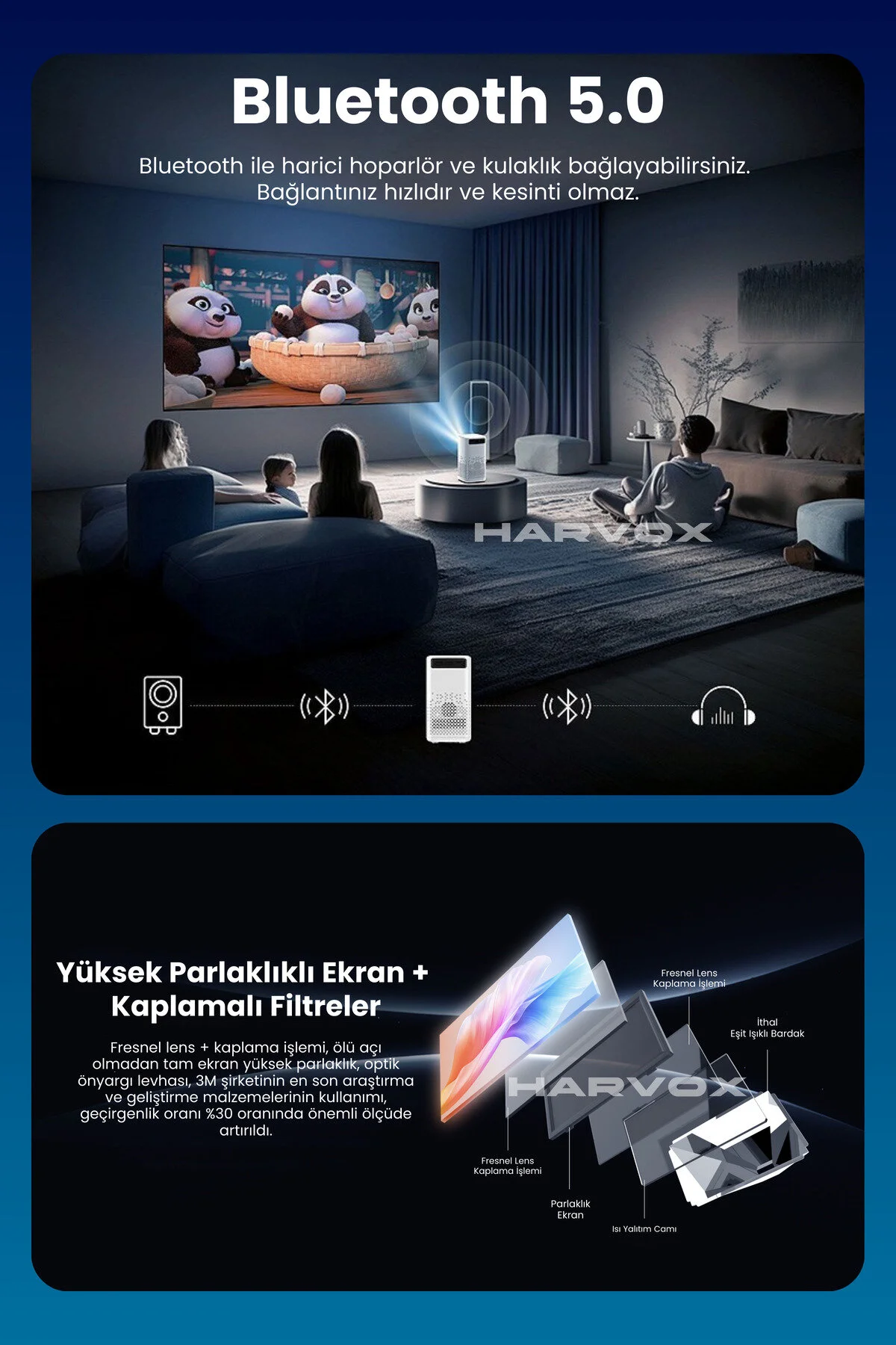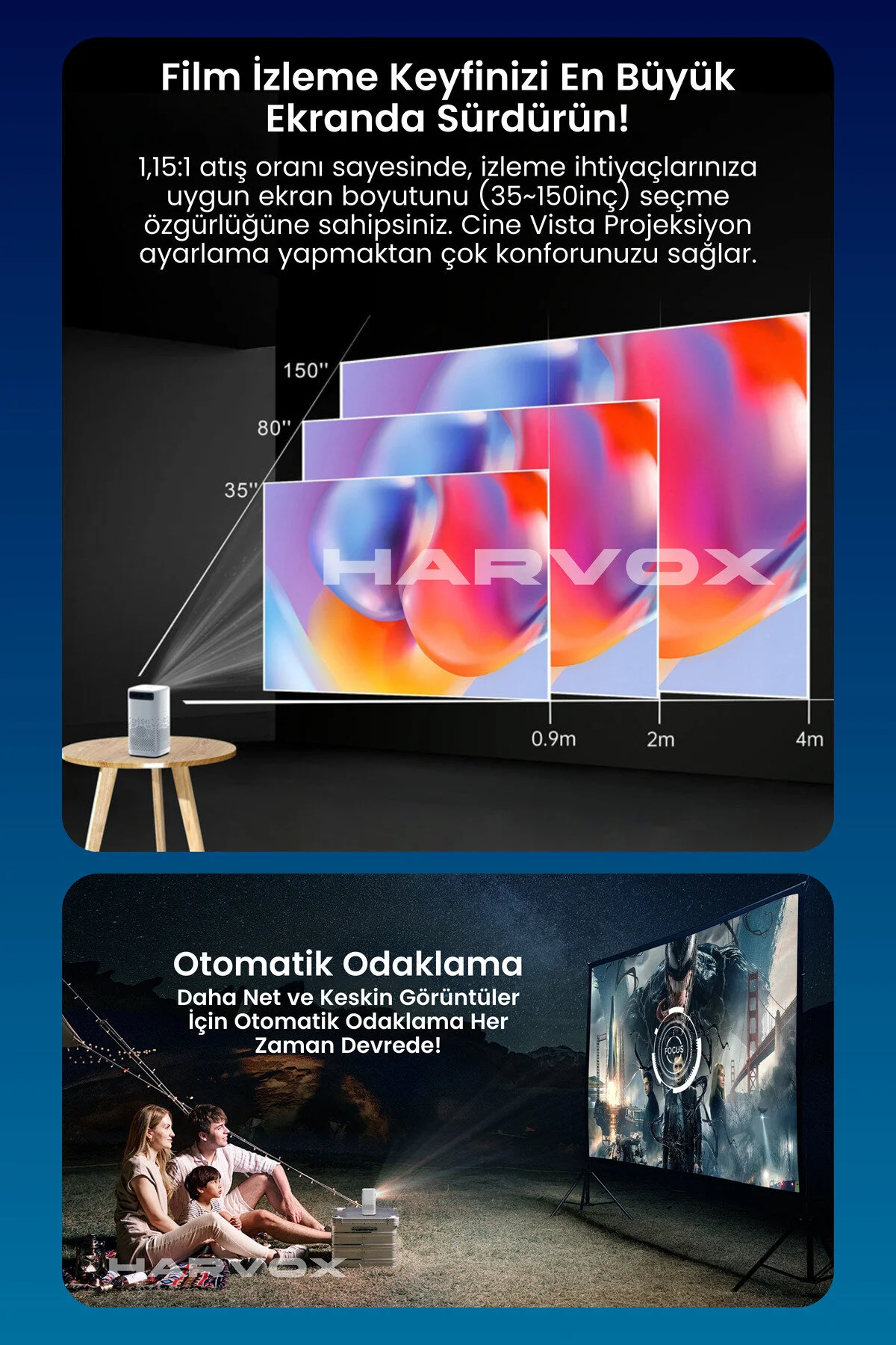 Ev sineması, film geceleri, sunumlar ve taşınabilir projeksiyon ihtiyaçları için Harvox Cine Vista, performans ve taşınabilirliği bir arada sunar.