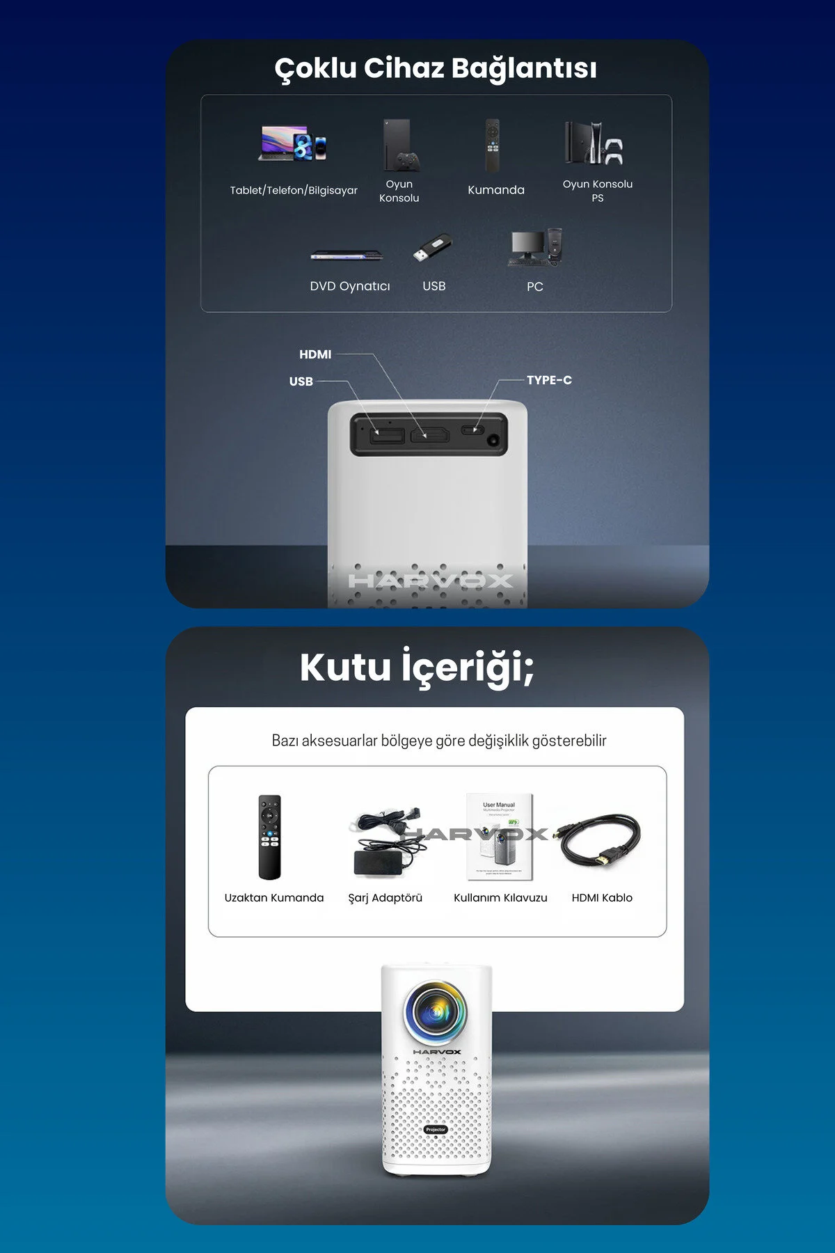 Harvox Cine Vista Bataryalı Taşınabilir Projeksiyon | Full HD 1080P | 4K Destek | Kablosuz | LED Projektör