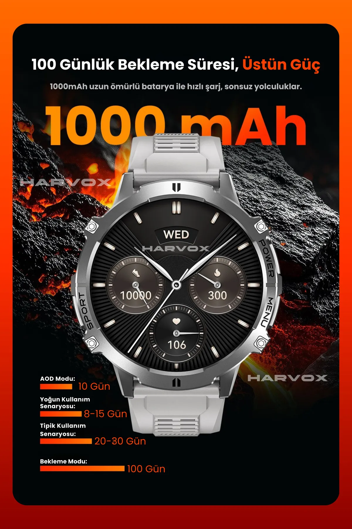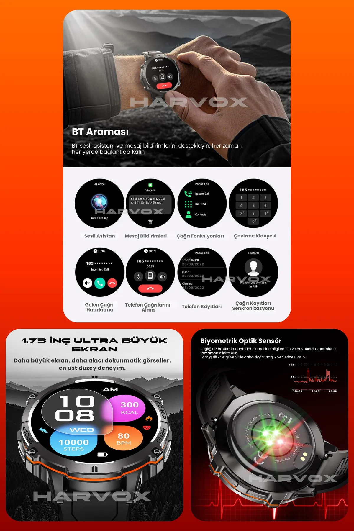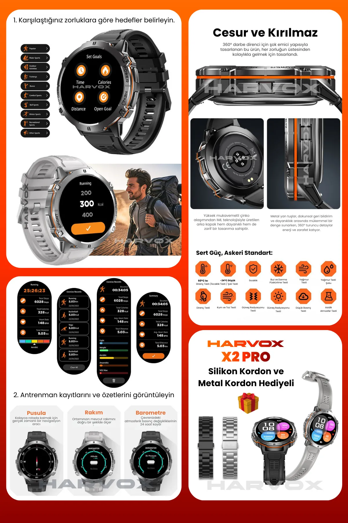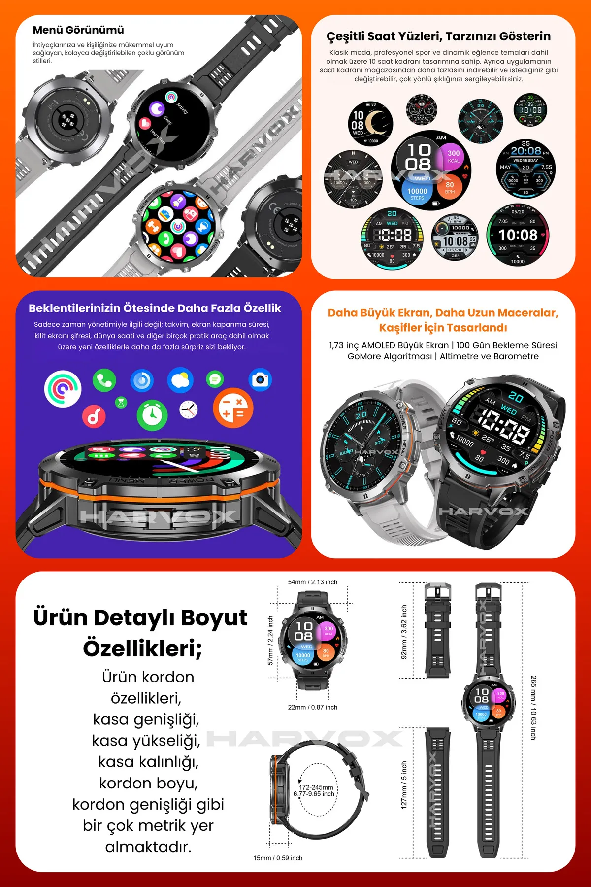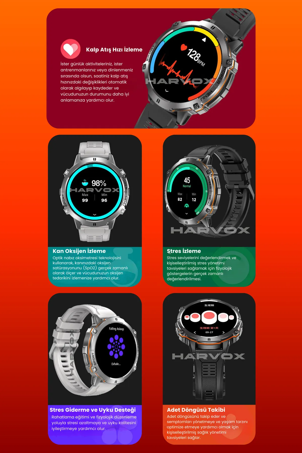 Harvox X2 Pro; 1,72” AMOLED tam dokunmatik ekranı, 100 güne varan pil ömrü ve gelişmiş sağlık takibi özellikleriyle günlük hayatını kolaylaştırır. iOS ve Android uyumluluğu sayesinde tüm bildirimlerin, aramaların ve spor aktivitelerin tek dokunuşla bileğinde.
